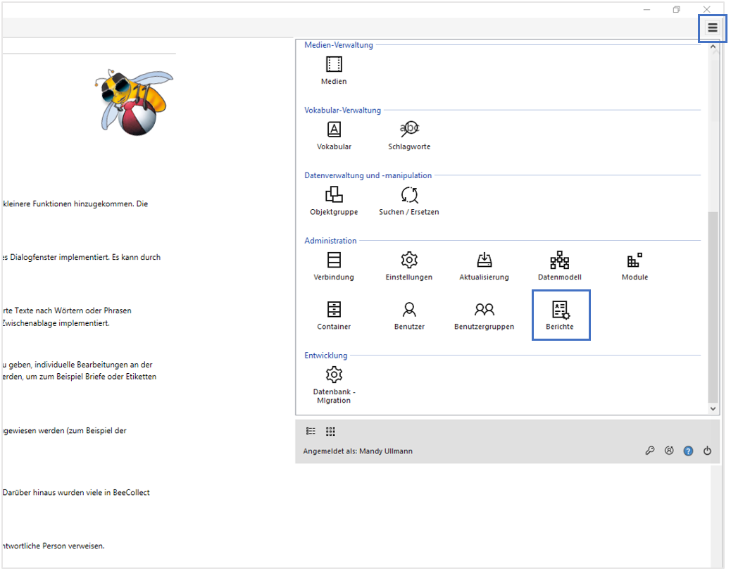 Sie befinden sich hier: start » docs » module » berichte » berichte_erstellen : menue_beecollect_professional_ber.png
